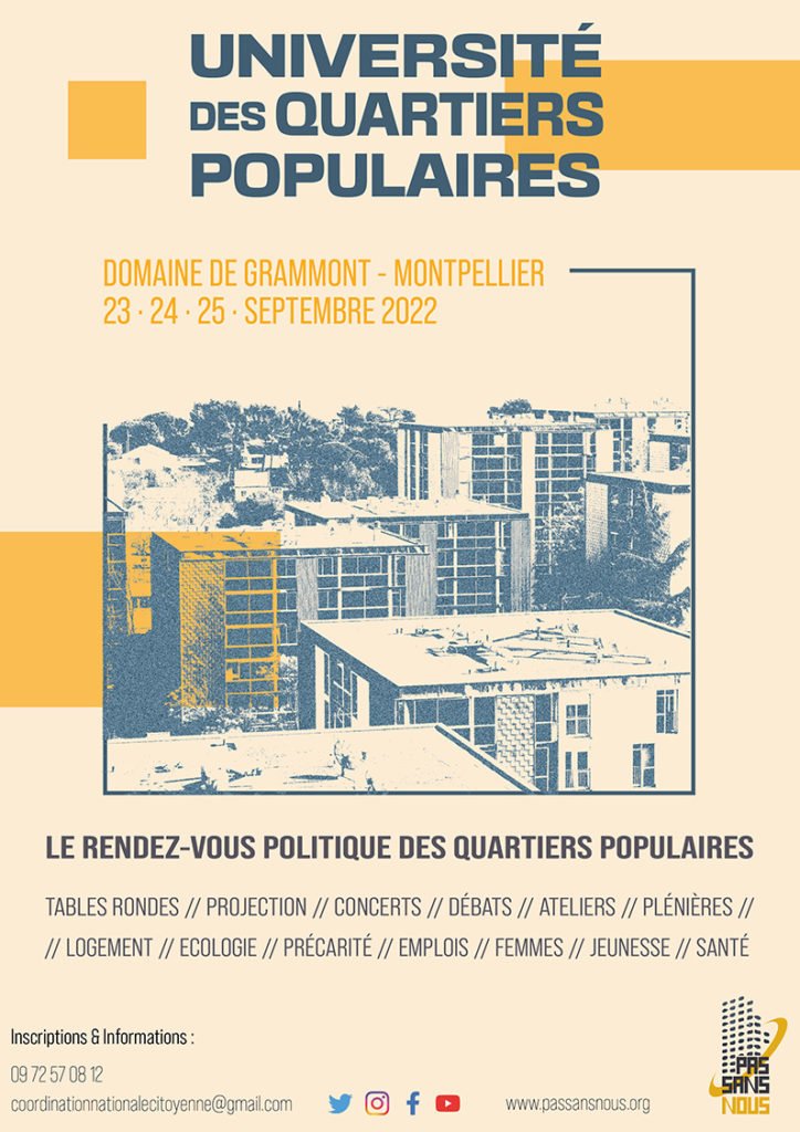 La Coordination nationale Pas sans Nous organise sa 3ème Université des Quartiers Populaires, les 23, 24 et 25 septembre 2022, à Montpellier. L’UQP est conçue comme un moment de rencontres, d’échanges et de mobilisation pour les habitant·es des quartiers populaires, adhérent·es, militant·es et sympathisant·es. Durant ces trois jours, seront mis au débat les thèmes chers à PSN depuis sa création […]